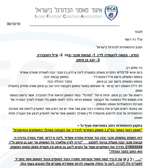 מכתב איגוד המאמנים לעו"ד ניר רשף, תובע ההתאחדות לכדורגל: