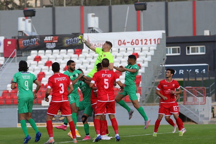 שוער אום אל פאחם, תומר ליטבינוב מעל כולם. צילום: עודד חסין