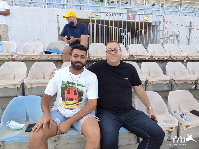 שחקן הרכש החדש של הרצליה, מתן כהן, בא לצפות במשחק יחד עם סוכנו גיא וייס (צילום : יח''צ)