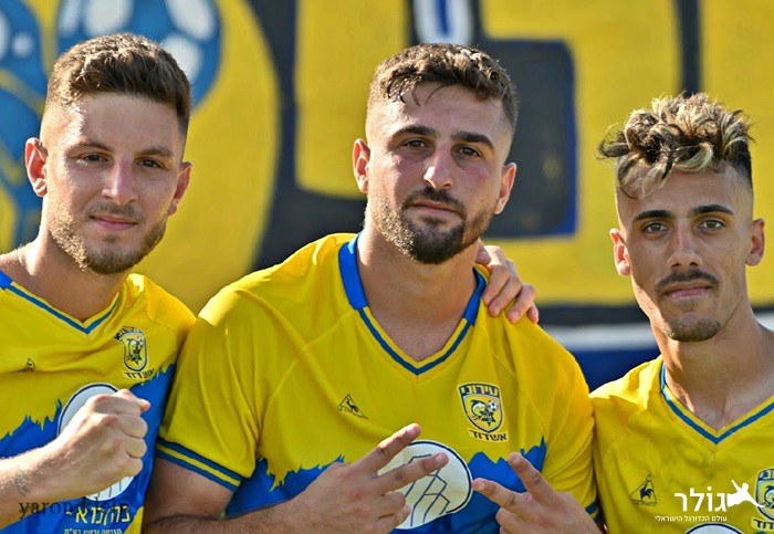 עמית מלכה באמצע. צמד בישלוים שלו הביאו ניצחון גדול לקבוצתו על מודיעין. צילום: איציק שטינבורצל - דוברות אשדוד.
