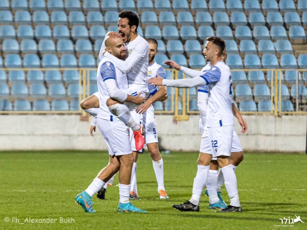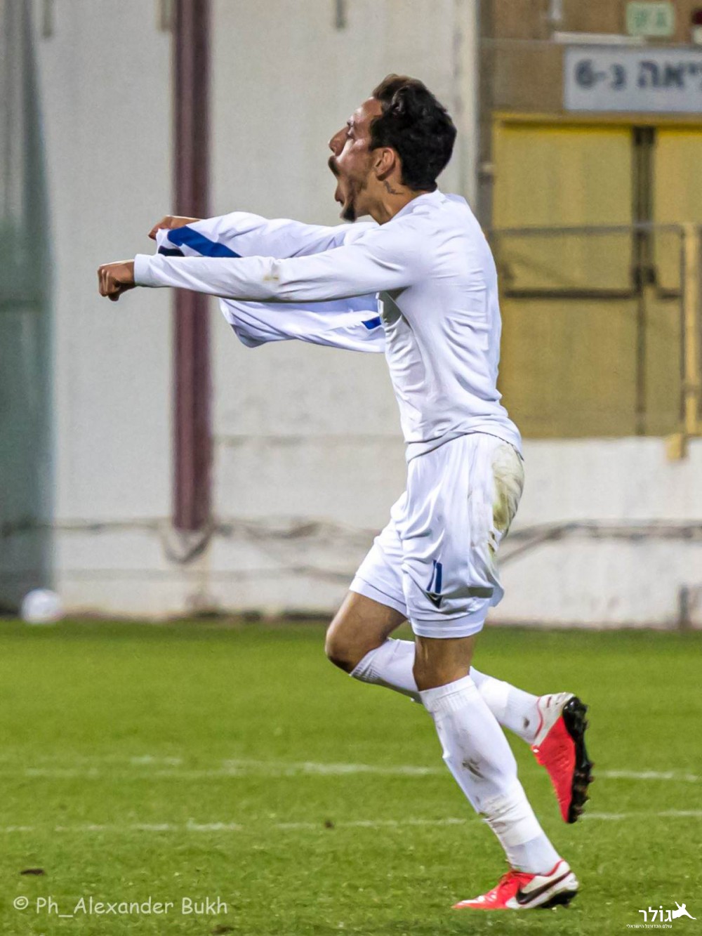 תום מדהלה חוגג שער ניצחון למכבי הרצליה. צילום: אלכסנדר בוך