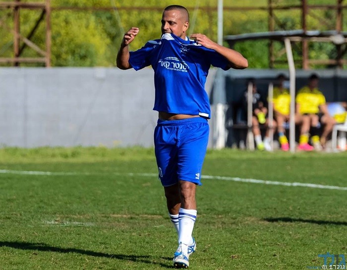 רונן פרץ רץ לחגוג את שער היתרון עם הספסל (מני בן-ארי)
