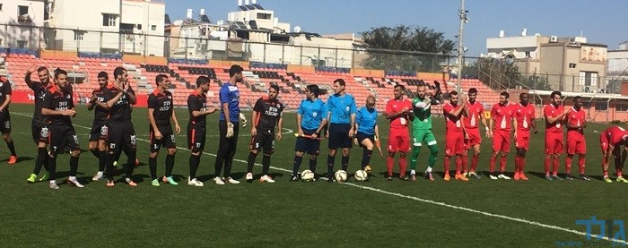שחקני שתי הקבוצות לפני פתיחת המשחק (אבייתר ברק)