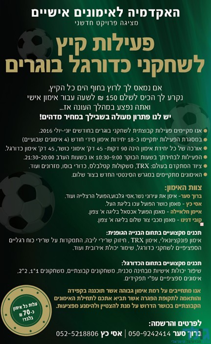 אנו מציעים מסגרת לשחקני בוגרים לתקופת הקיץ אשר תתקיים בחודשים יוני-יולי במגרש הסינטטי החדש בצור שלום. הפעילות כוללת 4 אימונים שבועיים של 90 דקות , ובסך הכל 17-18 אימונים חודשיים. האימונים , אשר הותאמו לצרכים של שחקן הכדורגל בתקופת הפגרה , כוללים גם בנייה גופנית וגם אימוני כדורגל.