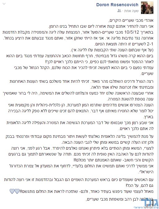 מודה ועוזב: דורון רוזנקוביץ' לא ימשיך במכבי שעריים