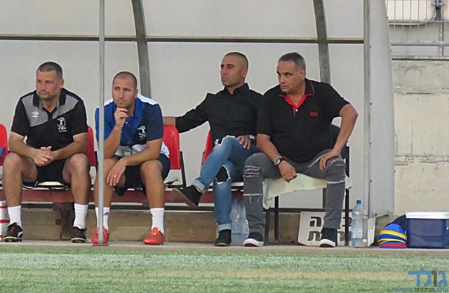רפי בוסקילה ושמעון הדרי על הספסל יחד עם חלק מהצוות המקצועי. (צילום: אלעד שומינוב)