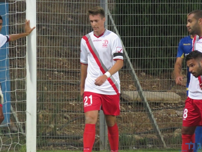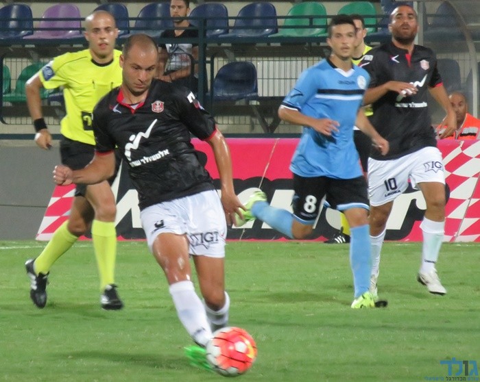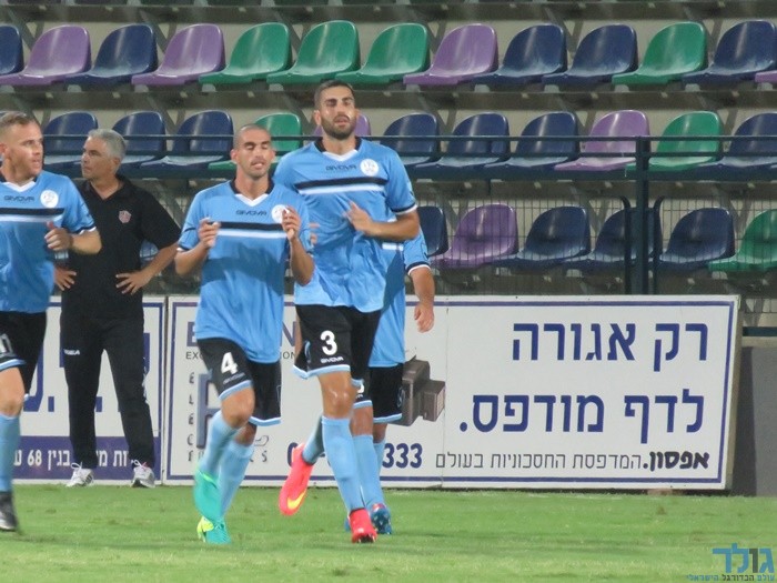 רוקאס סטאנולביצ'וס כבש נגד מכבי הרצליה את שער הבכורה שלו בנצרת עלית. (צילום: אלעד שומינוב)