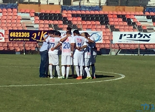 שחקני יפו יחד עם אורי קרגולה רגע לפני פתיחת המחצית השנייה (אבייתר ברק)