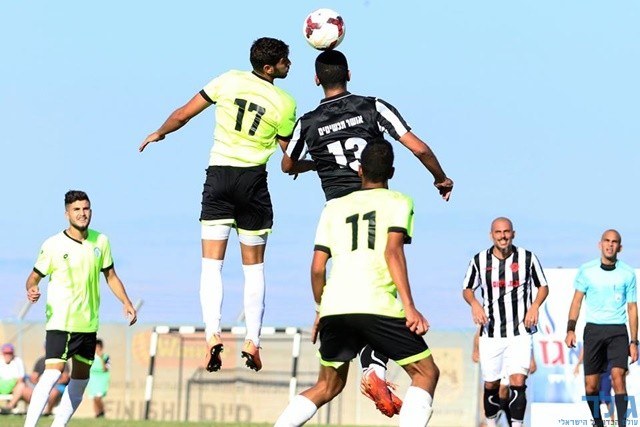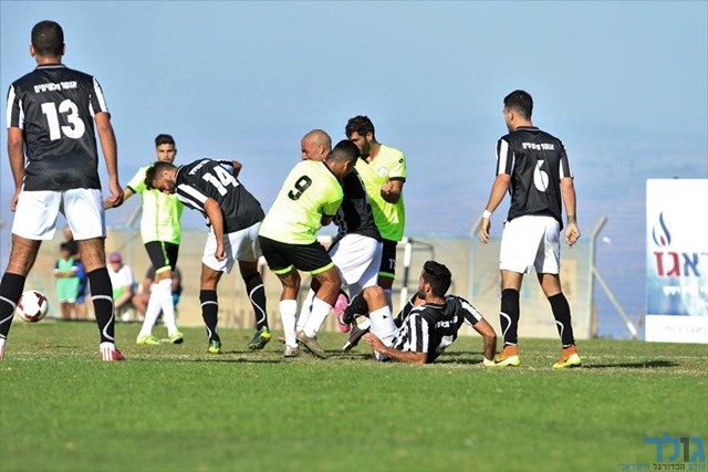 שחקני שתי הקבוצות בקרב עיקש על הכדור (עודד חסין)
