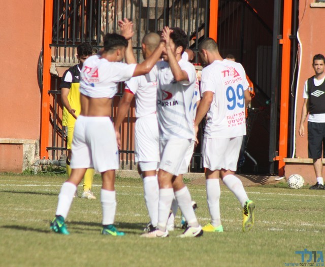 שחקני מכבי יפו חוגגים. יפו עם תקציב נמוך ועד שלא יגיע רוכש הם ישארו בליגה א. (צילום: ארז נעמן)