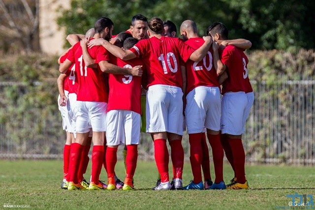 שחקני הפועל הרצליה לפני פתיחת המשחק (מאור אלקסלסי)
