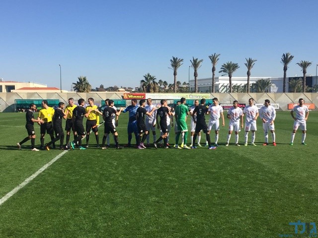 שחקני שתי הקבוצות לפני פתיחת המשחק (אבייתר ברק)
