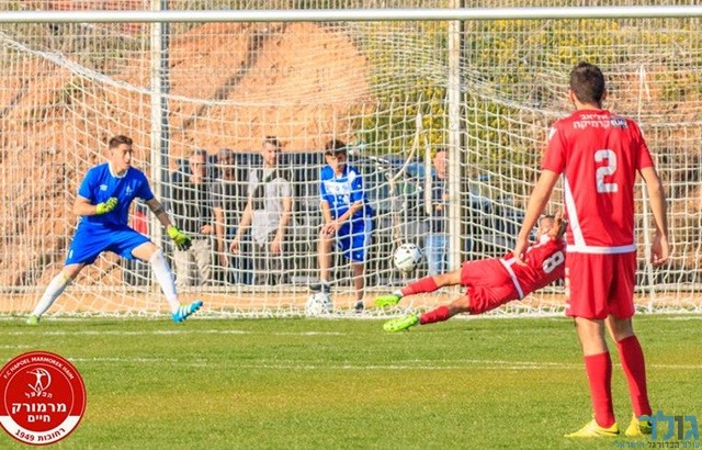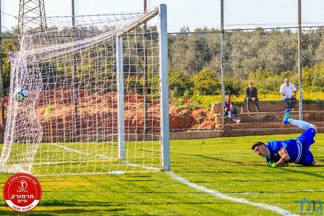 רביבו בועט והכדור נעצר רק ברשת. ניהול משחק וכיבוש שער בכורה במדי מרמורק (צילום: יוסי סוריק)