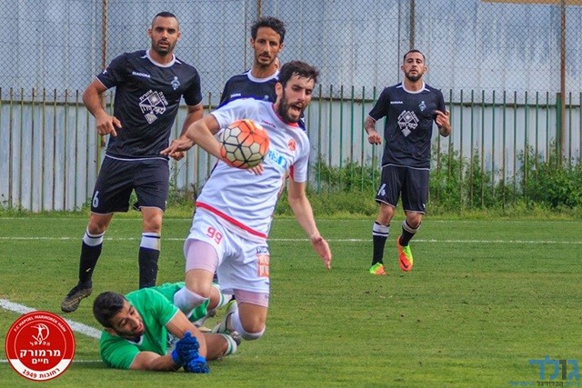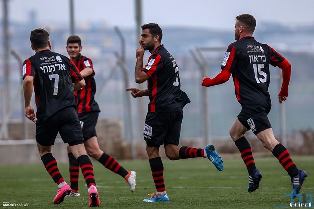 יובל אשכנזי עם שער ניצחון על כפר קאסם. שתי הקבוצות עשויות להיפגש שוב בפלייאוף (צילום: מני בן ארי)