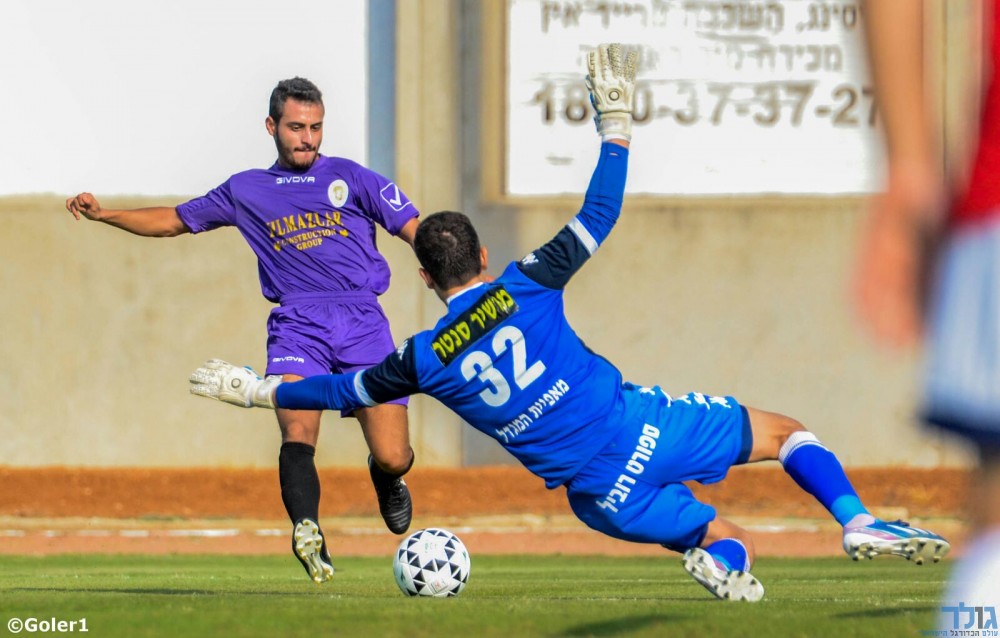שוער כפר קאסם מציל את קבוצתו מחלוצי חולון. (צילום: מני בן ארי)