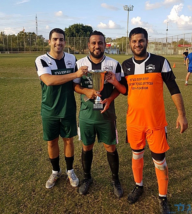 איציק לוי, קפטן שיכון מניף גביע יחד עם השוער אבירן דלל ורן לוזון הבלם...