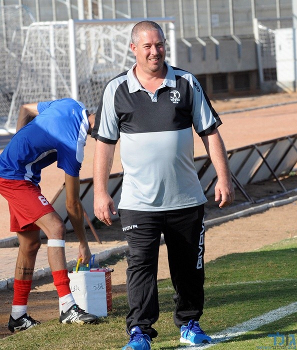 יוסי חכים, מחבק את דניאל רז. חכים הכין מצויין את קבוצתו למשחק. צילום: איתן ידגר.