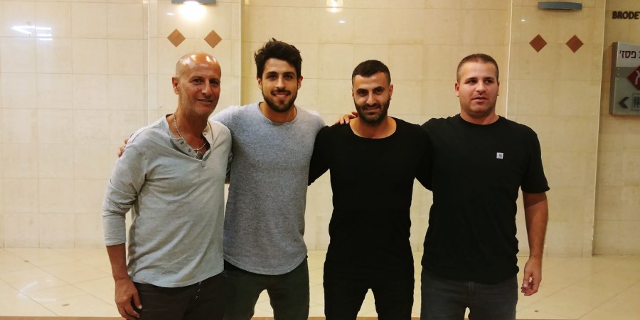 ריף פרץ וסוכנו אורן יחזקאל עם נציגי שמשון תל אביב לאחר החתימה בקבוצה