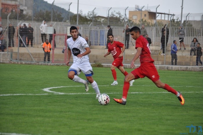 חליל חגאב מכפר כנא מנסה לחטוף לעומר כהן את הכדור. עמור במשחק מצויין. צילום: חגג רחאל.