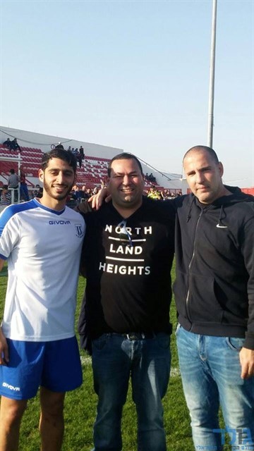 שמעון ועקנין מאמן שמשון מימין ועוזרו נאור אלדד משמאל וביניהם האוהד המסור ליאור טרי