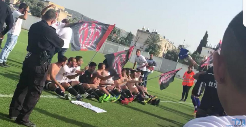 שחקני טירת הכרמל חוגגים הישארות בליגה ב' (דף הפייסבוק של הפועל טירת הכרמל)