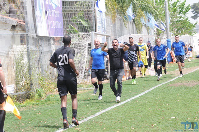 ציון עזרא, מאמן נחלה חוגג את השער הגדול של שרבוש. צילום: איתן ידגר.