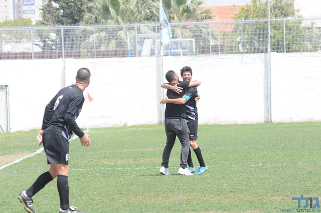 רוני אוחנה כובש את השלישי ומבטיח את ההישארות. חוגג עם מאמנו ציון עזרא. צילום: איתן ידגר.