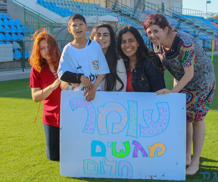 הנהלת ושחקני נס ציונה בצוותא עם אבי לודריק ובנות השירות הלאומי מגשימים לעומר חלום (אלכסנדרה בריל)