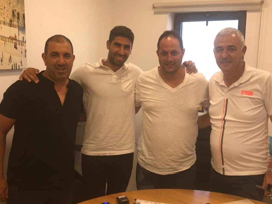 חבר ההנהלה עזרא סוכר, ליאור שלומן יו״ר הקבוצה, מאמן הקבוצה שלומי שלמה והחלוץ רועי דיין לאחר החתימה