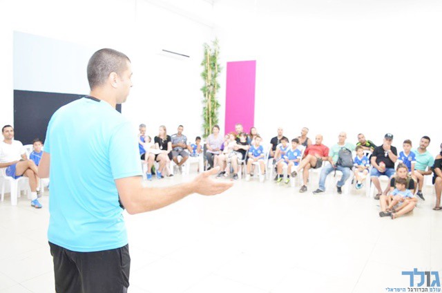 אבי בבאי יחד עם ילדי בית הספר לכדורגל והוריהם