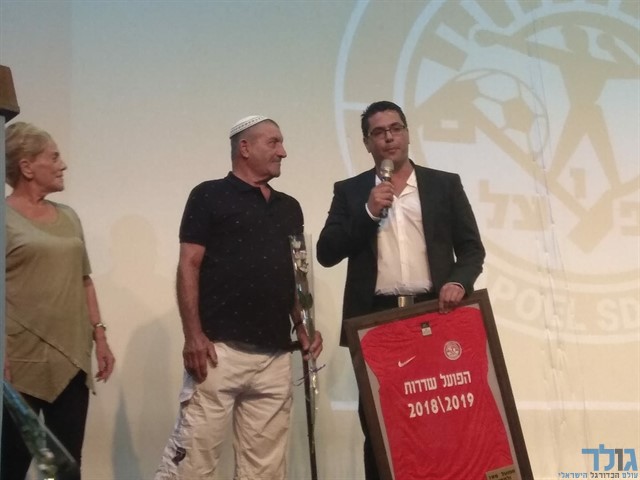 חיים בוהדנה אגדת כדורגל מקומית, מותיקי הפועל המיתולוגית מקבל חולצת הוקרה מיו"ר הפועל ג'קי ג'לדטי.