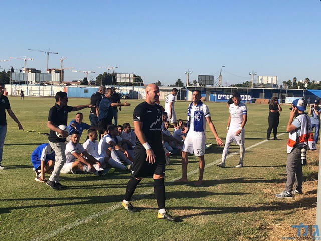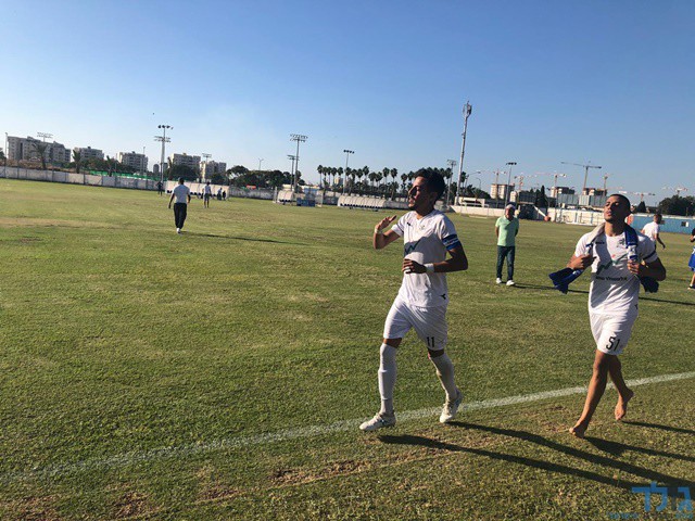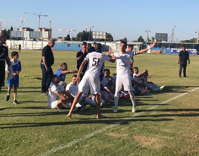 שחקני מכבי שעריים בראשותו של תום מדהלה חוגגים ניצחון ענק! (אבייתר ברק)