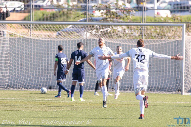 יאיר שפונגין כובש שער נהדר וחוגג עם גיל סלם ומוחמד אזברגה. (דן יידוב)