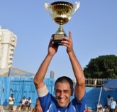 משה כהן(משמאל),אמיר עזרא,אלון אלי והילד חוגגים עם הגביע.(צילום:רגב גולדמן)