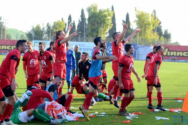 שחקני כפר קאסם מאושרים בסיום המשחק (מני בן ארי)