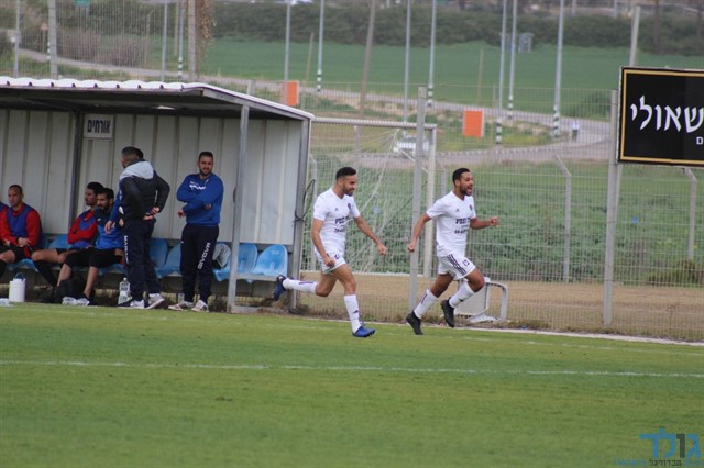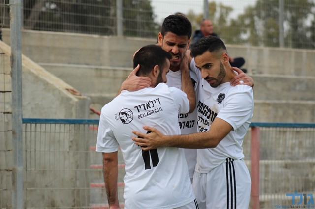 שחקנים אסי גלבוע חוגגים בסיום המשחק (חגאג רחאל)