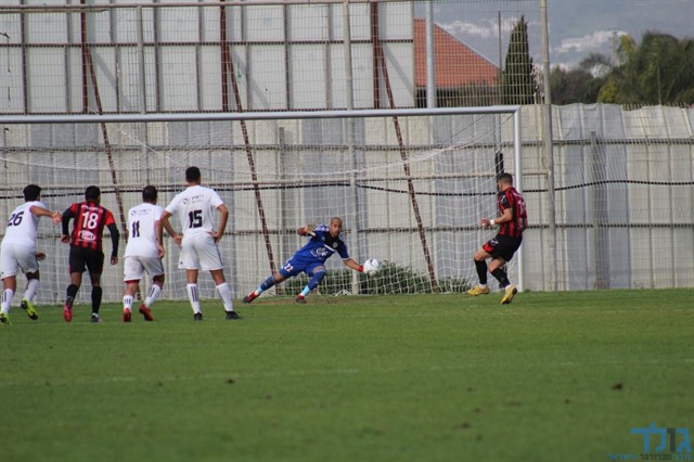 החלוץ המצוין אבי מלכה, בועט פנדל ישירות לשער של יקיר קרטה, ומצליח לצמק. (צילום: חגאג ראחל)