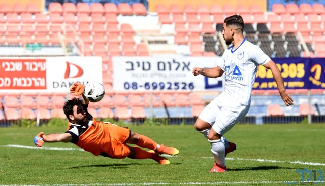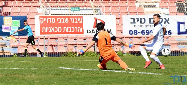 סער שבתאי מחטיא שני מצבים טובים במחצית הראשונה מול שוערה של בית"ר כפ"ס גל לובטון (מני בן ארי)