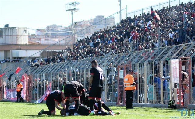 אום אל פאחם חוזרת לנצח והשחקנים חוגגים (צילום: גסאן אבו פאני )