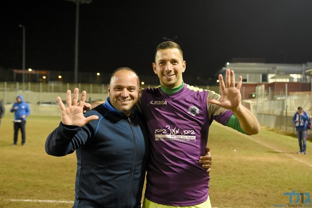 שוער שדרות מסמן את תוצאת הסיום יחד עם עוזר המאמן אביחי ג'ורנו (צילום: אורי גבאי מדיה מכבי שדרות)