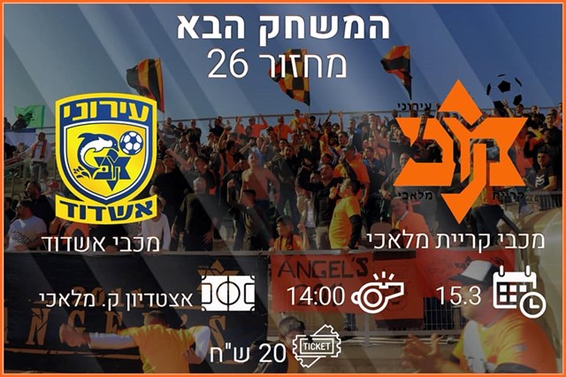 קריית מלאכי, תארח במסגרת המחזור ה-26 את עירוני אשדוד למשחק עם חשיבות גבוהה מאוד להמשך דרכן של שתי הקבוצות שצמאות לעלייה. כל הכרטיסים למשחק נמכרו מהר מאוד, וארגוני האוהדים של הקבוצות צפויים להציג תצוגת עידוד מדהימה, שלא תבייש קבוצות בליגת העל. ביום חמישי יתקיים האימון מסכם בקריית מלאכי, וצפויים להגיע כ-150 אוהדים.