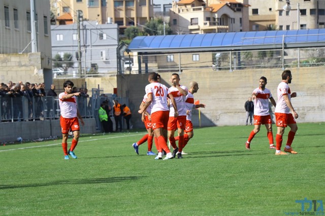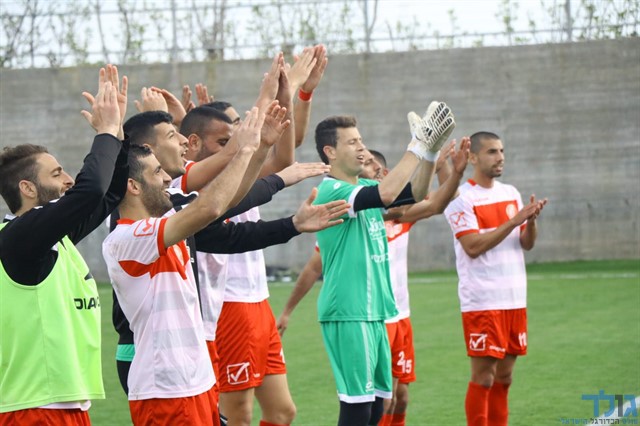 אוהד קדוסי המצוין כובש את הראשון וחוגג עם חבריו (רמזי אבו אלהיג'א)