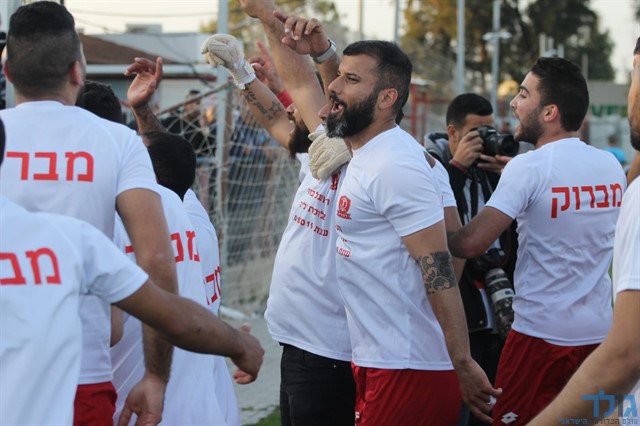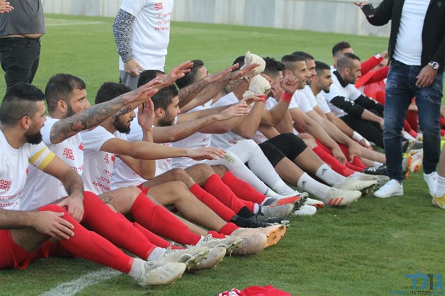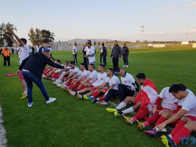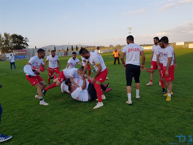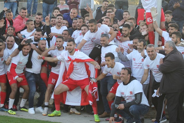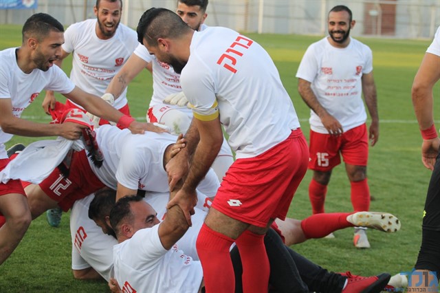 שחקני הקבוצה חוגגים ניצחון גדול על סנדלה גלבוע, ועליית ליגה היסטורית (צילום: אחמד עזאיזה)