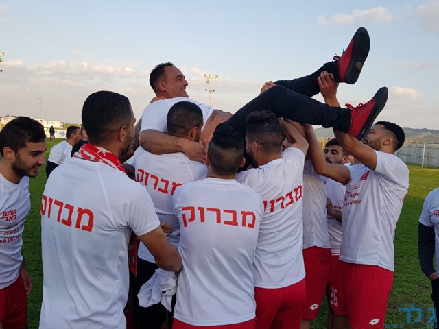 השחקנים חוגגים עם המאמן המצוין, וקבלן העליות חנא פרהוד (צילום: אחמד עזאיזה)