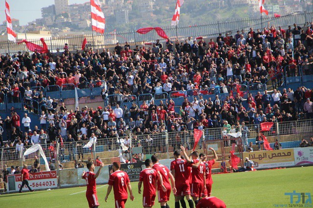שחקני אום אל פאחם חוגגים על רקע הקהל הגדול שלהם (חגאג רחאל)