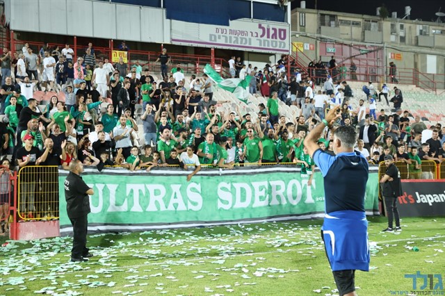 המאמן המצוין עופר טלקר, והקהל של מכבי שדרות בסיום המשחק (צילום: אורי גבאי)