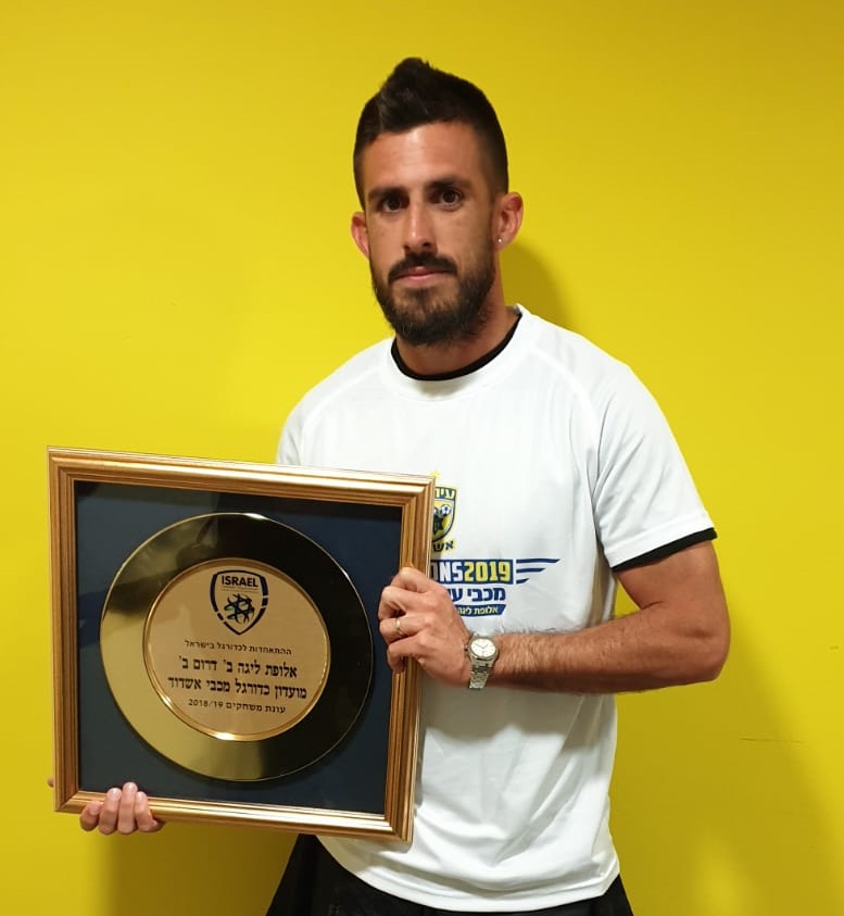 גיא עובדיה עם צלחת האליפות של עירוני אשדוד
