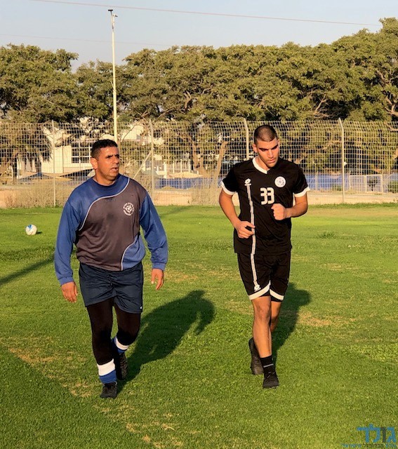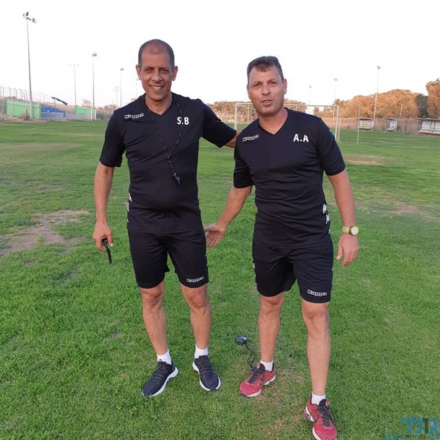 שמעון ביטון מאמן הקבוצה יחד עם אלירן אבו מאמן הכושר (צילום: דן בונבידה)