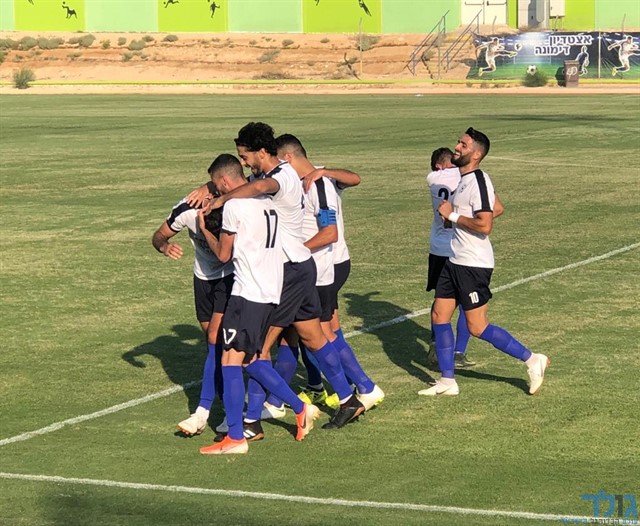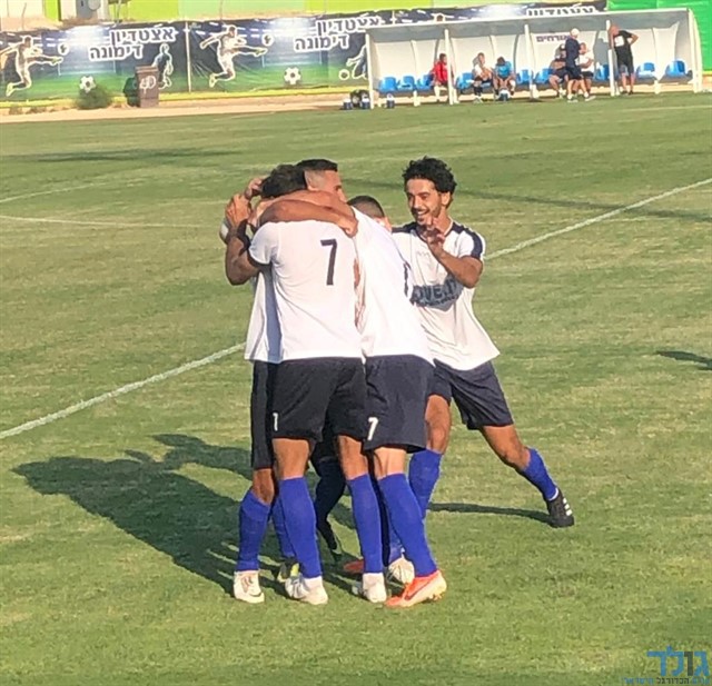 שחקני דימונה חוגגים יתרון 2-0 אחרי מחצית ראשונה שקולה (צילום: דן בונבידה)