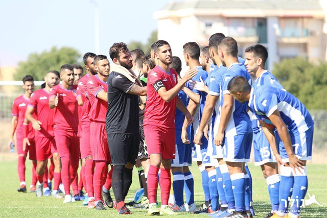 שחקני שתי הקבוצות לפני פתיחת המשחק (עודד חסין)